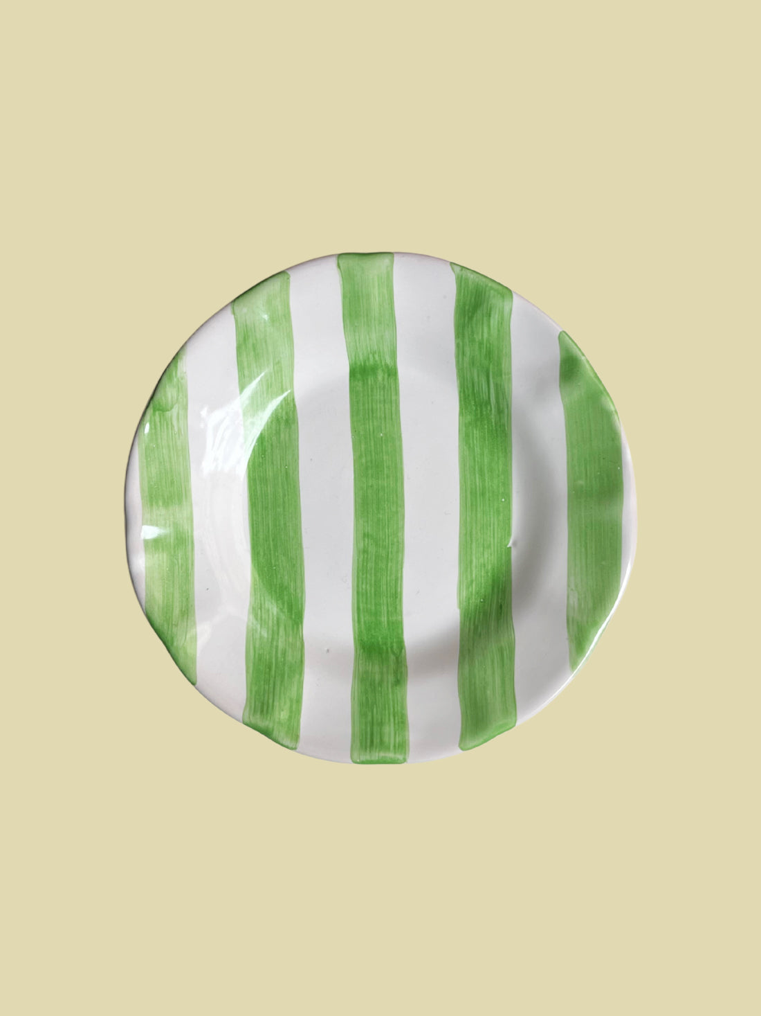 Handmålad assiett från Italien i ett grönrandigt mönster. Fin att blanda med rutig assiett i samma färg eller mixa olika färger randigt. Finns i 3 färger. Mått 16cm.