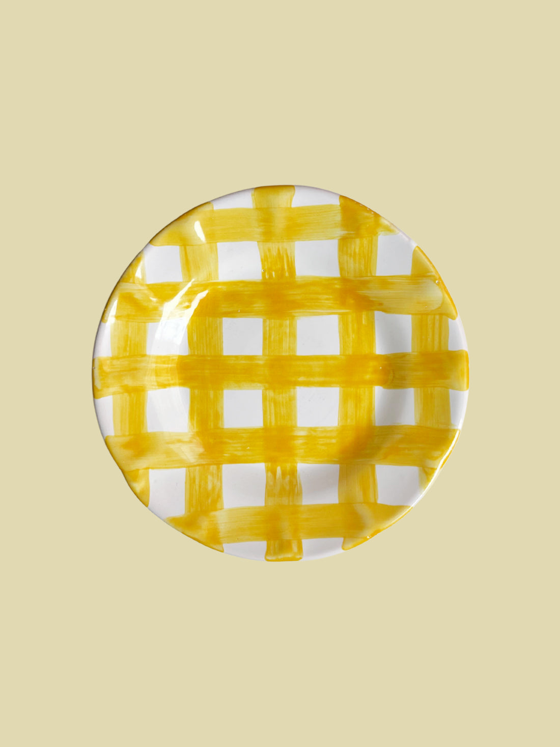 Handmålad assiett från Italien i ett gulrutigt mönster. Fin att blanda med randig assiett i samma färg eller mixa olika färger rutigt. Finns i 3 färger. Mått 16cm.