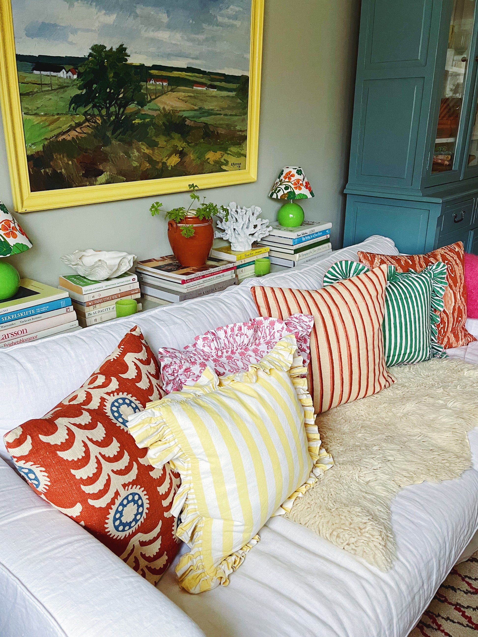 Striped cushion cover block-printed by hand using traditional butti techniques and ancient craftsmanship from Jaipur. Made in 100% cotton with a contrasting embroidery frill. Dimensions: 40x40cm.