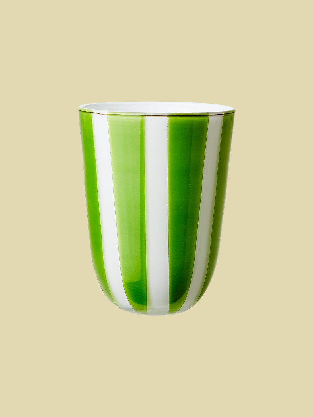 Randig ljuskopp eller vas i grönrandigt mönster. Mått: 11 cm.