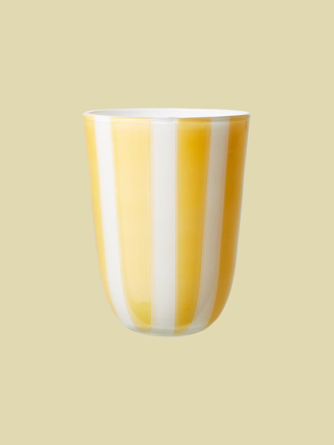 Randig ljuskopp eller vas i gulrandigt mönster. Mått: 11 cm.