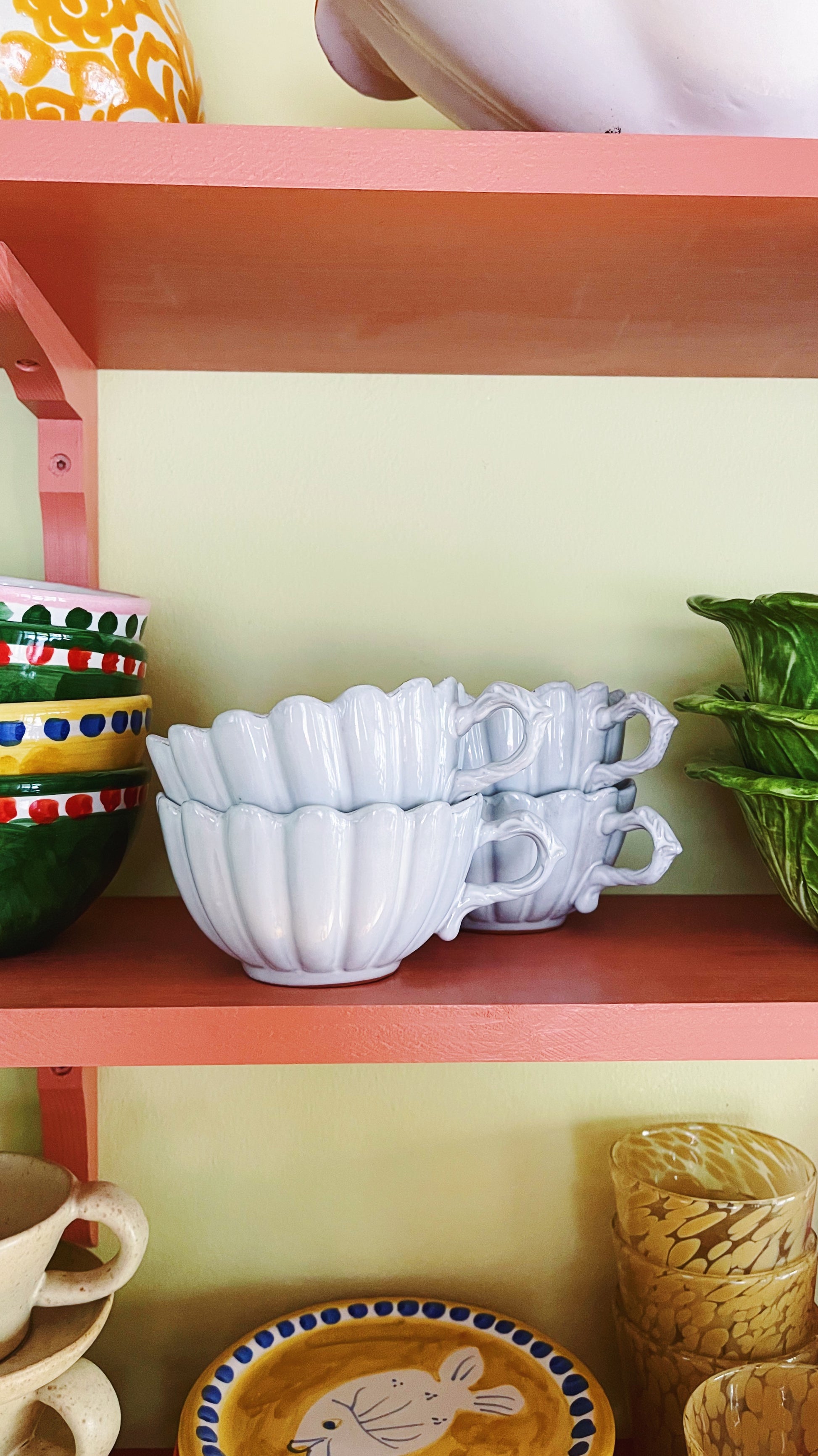 Elegant cup with scalloped edges and a glossy white glaze. Made in France. Perfect for your morning coffee or afternoon tea. A classic piece that pairs beautifully with colourful ceramics or matching scallop plates.